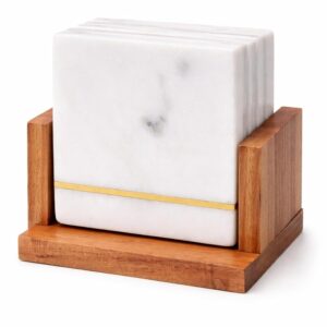 White Marble Stone Coaster Set with Acacia Wood Holder