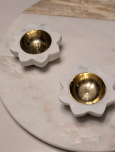 Elevate your home with these magnificent diya holders, a perfect fusion of natural artistry and polished luxury. Hand-carved from the finest Carrara marble, each piece is a unique masterpiece, with intricate veining that tells a story of its origin. The brass inset gleams with a rich, golden luster, creating a captivating play of light that transforms any space into a haven of tranquility. Whether used for ceremonial purposes or as a sculptural statement piece, these holders are designed to be cherished for a lifetime.