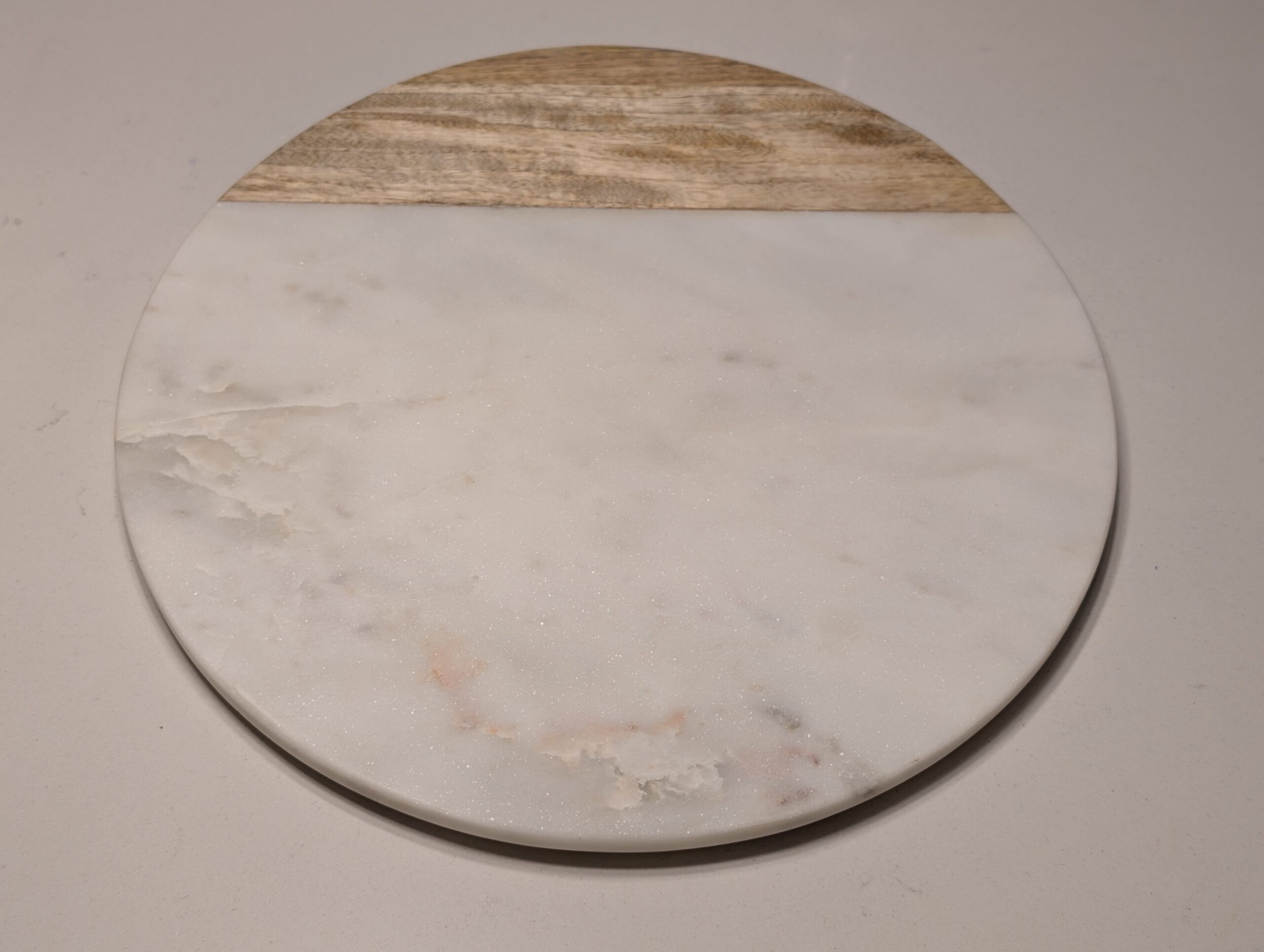 This elegant cutting and serving board features a unique two-tone design, combining the natural warmth of a grained wood top with the cool, smooth sophistication of solid white marble. Ideal for use as a cheese board, a charcuterie platter, or a stylish centerpiece for your kitchen, its durable construction and beautiful material contrast make it a versatile and timeless addition to any home.
